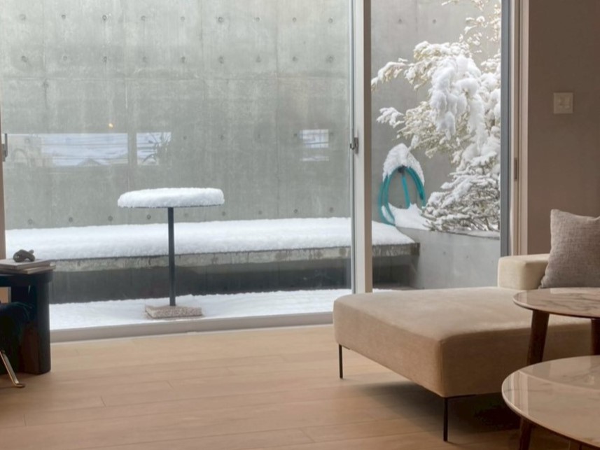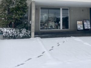 外をみると、R-LABELの植栽や2階のバルコニーはすでに4~5センチの積雪になっていました。日中も綿のようなふわふわの雪が舞うように降り続いていて、さらに積もりそうな勢い。